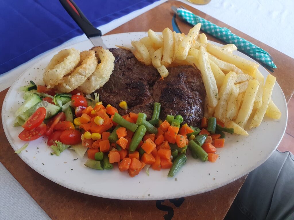 Natürlich isst er dann noch den Rest meiner Pizza und fast die Hälfte von Lesly‘s Pizza. Christian hat ein Steak mit Pommes und Gemüse bestellt. Das Steak ist aber so schlecht, dass es laut Christian eher wie eine Schuhsohle aus Gummi schmeckt. Das verdirbt ihm den Appetit und er lässt einen Großteil seiner Portion über. Insbesondere das Fleisch ist nicht kau- und somit nicht essbar.