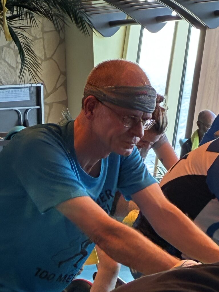Um bloß nicht irgendetwas zu verpassen, stellt er sich einen Wecker und steht um 05:30 Uhr auf. Dann geht er 1 1/2 Stunden auf dem Oberdeck laufen und geht dann nach dem Duschen wieder ins Bett. Dann springt er kurz vor Ende der Frühstückszeit wieder auf. Eine Mahlzeit auszulassen ist keine Option. Dann zum Frühschoppen, dann wieder Sport in Form von Spinnig, dann wieder Essen und so weiter.