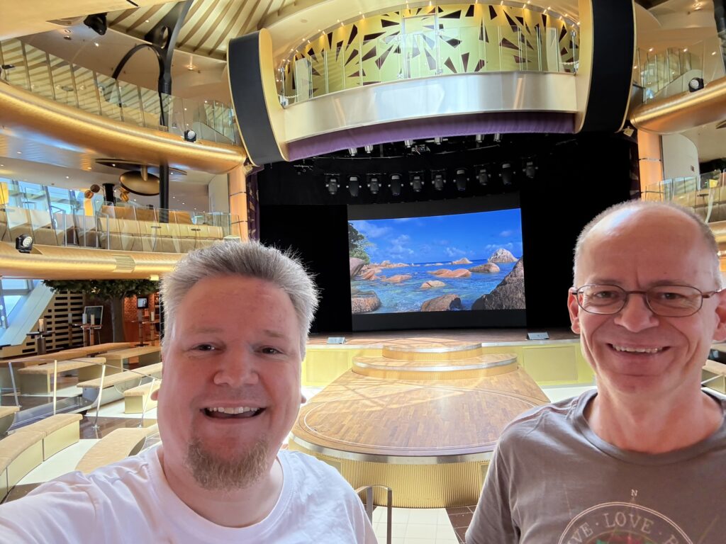 Nach dem sie unsere Berufe erraten haben, binde ich die vier spontan in unsere Seetagschallenge ein. Stefan und ich tippen wieviele Kreuzfahrten die vier insgesamt schon gemacht haben. Zunächst sieht es so aus, als wen ich knapp gewonnen hätte. Dann wird das schon verkündete Ergebnis um Flusskreuzfahrten korrigiert, was dazu führen würde, dass Stefan jetzt gewonnen hätte. Die Challenge wird somit insgesamt als ungültig erklärt.